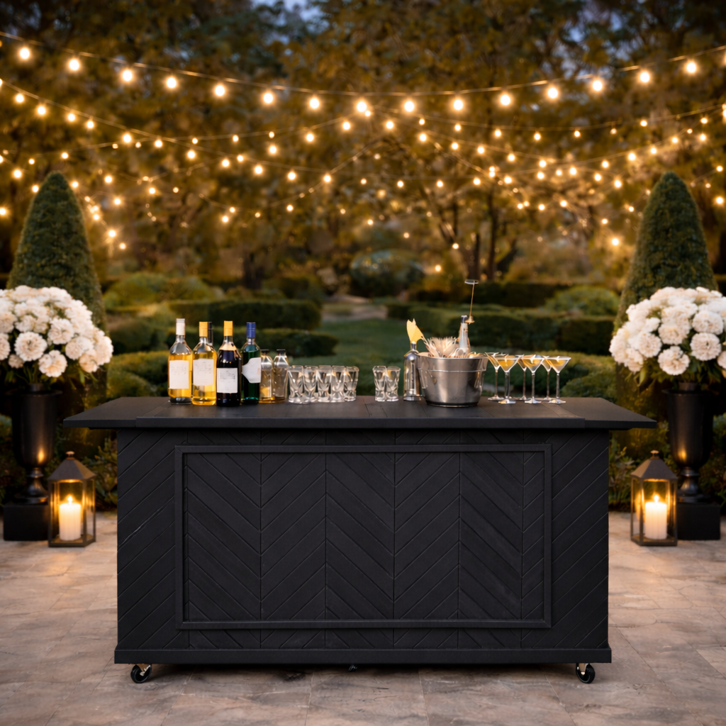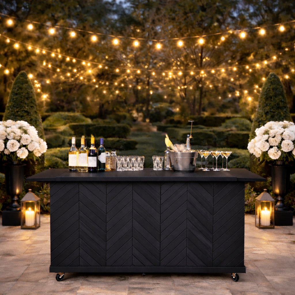 The Model 0107 Herringbone Front Charcuterie Cart features a distinctive angled slat pattern that adds craftsmanship and character to your presentation. The herringbone design creates a refined focal point, making it well-suited for statement displays at weddings, boutique events, and premium service environments. Like all Model 0107 carts, it collapses for transport and storage while offering a sturdy, professional platform for food and charcuterie service.