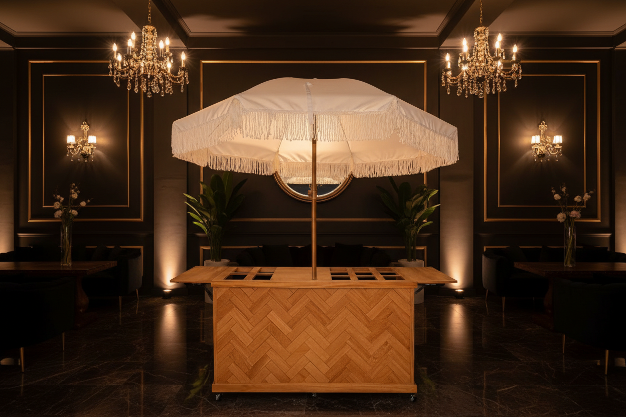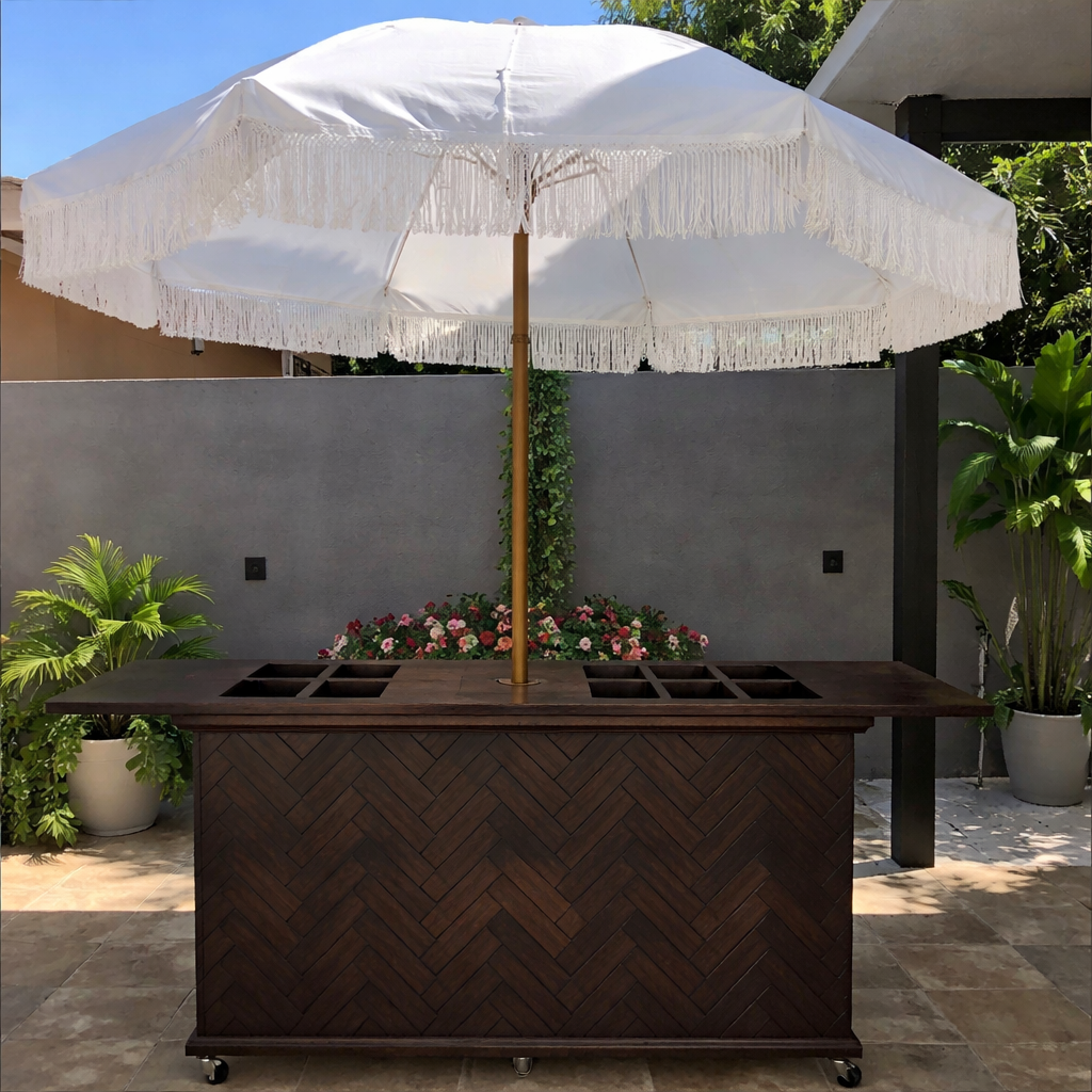 The herringbone front cart features a classic pattern that adds craftsmanship and visual depth to your event presentation. The angled wood layout creates movement and texture, making this style feel elevated, intentional, and distinctly handcrafted.