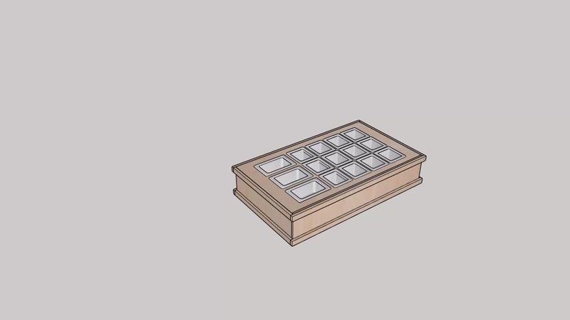 This tabletop charcuterie cart is inspired by our collapsible charcuterie cart #0107 and crafted for easy portability, making it ideal for intimate social events. Perfect for baby showers, bachelorette parties, house warmings, and similar occasions, this cart can be quickly taken apart and set up again in under a minute. You can customize the cart tops to suit your preferences at no additional cost. It fits pans from 2 to 6 inches deep, providing enough space to slide in an ice tray for added convenience.